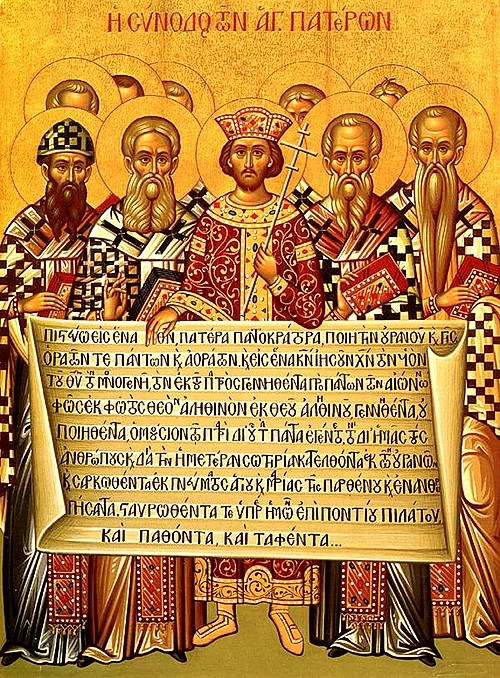 V reakci na neutuchající kontroverze ohledně podstaty Ježíše jako Syna Božího se po nějaké době rozhodl císař Konstantin I. Veliký svolat roku 325 do své císařské rezidence v Niceji, jedné maloasijské vesnici, která leží nedaleko od Marmarského moře, první ekumenický koncil (či synodu). Sešli se tam biskupové východní církve a také několik klíčových zástupců její západních větve, dohromady přes 300 biskupů (podle pozdější tradice 318, viz Abrahamovi služebníci; Gn 14,14), řada presbyterů a diakonů. Po ediktu milánském, který učinil roku 318 z křesťanství legální náboženskou víru, se jednalo o další krok k integraci křesťanství a panující moci. Po obdobích pronásledování a skrývání, které křesťany od počátku provázelo, se nyní karty obrátily a křesťané jsou pozváni k jednání se samotným císařem! Ten si také dal, podle záznamu církevního historika Eusebia, patřičně záležet na tom, aby svým zjevem připomínal téměř andělského posla a ochránce nově uznaného křesťanského náboženství. Jeho cílem bylo zprostředkovat řešení, které by učinilo přítrž teologickým polemikám a sjednotilo křesťany ve společném vyznání. Toto vyznání (symbolum) nyní mělo sloužit jako prubířský kámen ortodoxie. Jeho poradci z řad západních biskupů byli silní zastánci Kristova pravého božství, a tak se i sám Konstantin ve výsledku zasadil o formulaci, kterou dnes známe jako nicejské vyznání víry, přestože konečné znění dostalo až na druhém ekumenickém koncilu o padesát let později (viz níže). Je rozděleno do tří článků, tedy vyznání víry v Otce Stvořitele, Syna Vykupitele a Ducha svatého. Toto vyznání, či „krédo“ známé jako Nicaenum, bylo přímou odpovědí na teologické názory Areia a jeho následovníků. Klíčová část vyznává podstatu Ježíše Krista následovně: